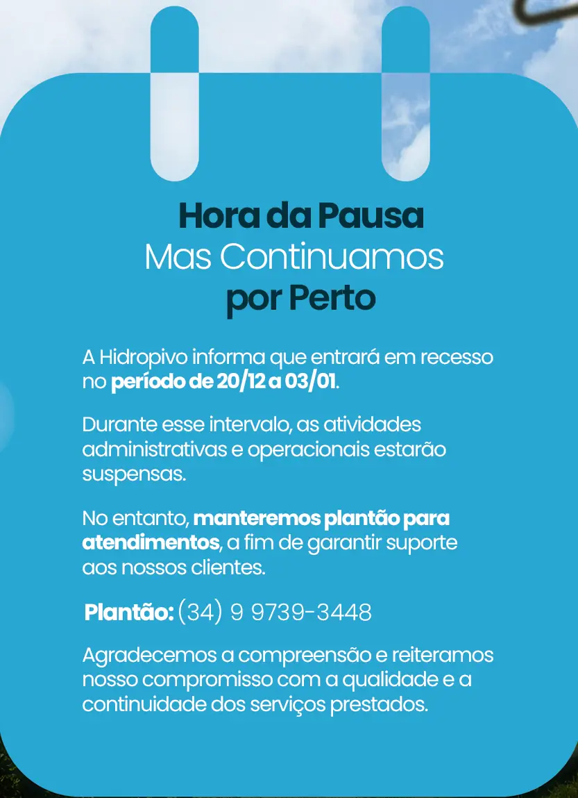 Nossa equipe está disponível 24 horas por dia, 7 dias por semana, para resolver qualquer problema e manter seu pivô sempre em funcionamento.